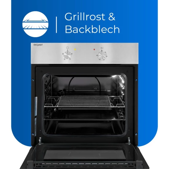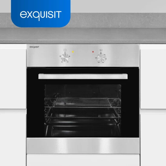 Der Einbaubackofen EBE 555-1.1 in der Farbe Inoxlook von Exquisit ist ein Blickfang für Ihre Küche. Die Energieklasse A (Skala Energieeffizienzklasse A+++ bis D) des Gerätes begeistert nicht nur Sie, sondern auch die Umwelt. Das Gerät selber hat folgende Ausmaße: 59,5 x 59,5 x 53,0 cm (Höhe/Breite/Tiefe). Als Einbaugerät integriert es sich optimal in Ihre exisiterende Küche. Der Einbaubackofen bietet Ihnen ein Garraum-Volumen von 62 Liter – reichlich Platz für die Zubereitung Ihres Gebäcks oder Speisen. Die Temperatur lässt sich im Bereich 50 – 250 °C regeln. Insgesamt 4 Funktionen stehen zur Selektion zur Verfügung. Hierzu gehören: Ober- und Unterhitze, Oberhitze, Unterhitze und mögliche Kombinationen einzelner Funktionen. Selbst bei schlechten Lichtverhältnissen behalten Sie Dank der hellen Backofenbeleuchtung den Überblick. Wenn Sie einen verlässlichen und leistungsstarken Einbaubackofen suchen, ist der EBE 555-1.1 von Exquisit genau richtig für Sie.