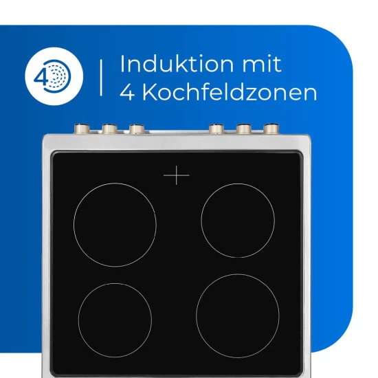 Der Standherd hat 4 Induktionskochplatten, die Sie individuell steuern können. Die Restwärmeanzeige zeigt Ihnen deutlich an, welche Kochzone heiß ist und verhindert auf diese Weise schmerzhafte Verbrennungen.