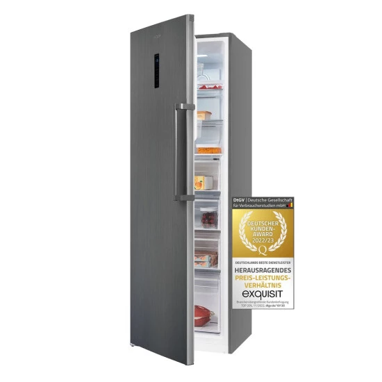 Nicht nur Ihre Lebensmittel werden den Gefrierschrank GS295-NF-H-040E inoxlook-az von Exquisit in der Farbe Inoxlook-dunkel lieben. Eine Energieklasse E (Skala Energieeffizienzklasse A bis G) entlastet nicht nur die Umwelt, sondern auch Ihren Geldbeutel. Die Maße des Gerätes betragen 185 x 59,5 x 65 cm (Höhe/Breite/Tiefe). Auf welcher Seite sich das Gerät öffnen lässt, definieren Sie dank wechselbarem Türanschlag. Der Gefrierbereich bietet 274 l Nutzinhalt und besitzt ein Gesamtgefriervermögen von 24,0 kg/24h. Dieses können Sie unkompliziert durch die 4 Gefrierschubladen ganz nach Ihren Anforderungen verwenden. Das Gerät verfügt eine Gesamtgefrierleistung von 4* Celsius im Gefrierbereich. Sparen Sie durch die Schnell-Gefrierfunktion viel Zeit: Ihre Lebensmittel werden in kürzester Zeit eingefroren. Die Temperatursteuerung erfolgt ganz einfach Elektronisch. Durch die integrierte Temperaturüberwachung müssen Sie sich keine Gedanken mehr über auftauchende Temperaturschwankungen machen. Über ein gut lesbares Display haben Sie die aktuelle Temperatur jederzeit im Blick und können bequem einzelne Funktionen des Gerätes steuern. Damit Sie auch im Dunkeln zielsicher an Ihre Lebensmittel gelangen, bietet Ihnen das Gerät eine LED-Beleuchtung. Wenn Sie ein verlässliches Gerät zum sicheren Lagern Ihrer Lebensmittel suchen, ist der Gefrierschrank GS295-NF-H-040E inoxlook-az von Exquisit genau richtig für Sie.