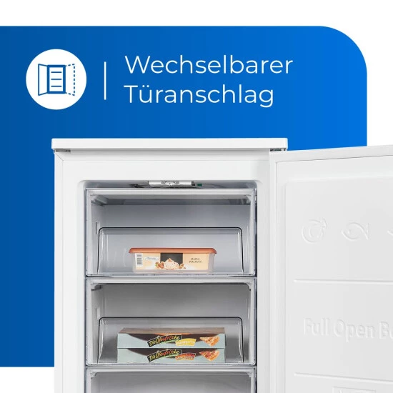 Der Gefrierschrank bietet reichlich Platz für sorgenfreies Lagern über einen längeren Zeitraum. Insgesamt stehen Ihnen 97 l Nutzinhalt zur Verfügung. Das Gerät in der Farbe Weiß hat die Abmaße 85,0 x 55,1 x 57,5 cm (Höhe/Breite/Tiefe) und hat die Energieeffizienzklasse E (Skala Energieeffizienzklasse A bis G). Durch seine freistehende Bauart lässt es sich an jedem Ort aufstellen und in Betrieb genommen werden. Der wechselbare Türanschlag sorgt hierbei für noch mehr Flexibilität beim Aufstellen. Der 4*-Gefrierbereich verfügt über eine Kapazität von 97,0 l und bietet den idealen Ort für Eis, Tiefkühlpizza und alles andere.
