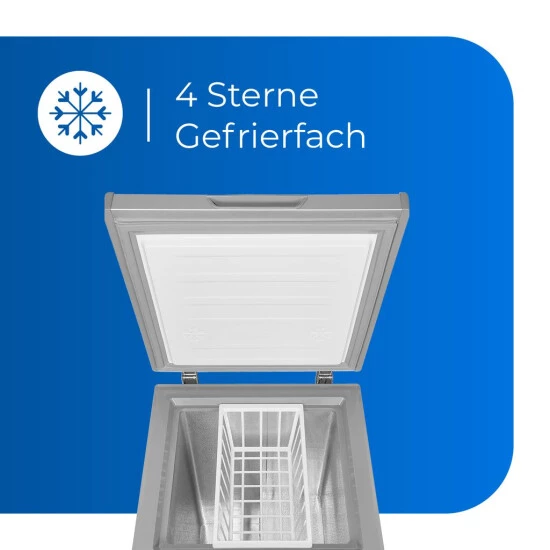 Die Gefriertruhe ermöglicht Ihnen das sorgenfreie Lagern über einen längeren Zeitraum. Insgesamt stehen Ihnen 96 l Nutzinhalt zur Verfügung. Das Gerät in der Farbe Silber hat die Abmaße 83,5 x 54,6 x 55,1 cm (Höhe/Breite/Tiefe) und hat die Energieeffizienzklasse E (Skala Energieeffizienzklasse A bis G). Durch seine freistehende Bauart lässt es sich an jedem Ort aufstellen und in Betrieb genommen werden. Der 4*-Gefrierbereich verfügt über eine Kapazität von 96,0 l und bietet den idealen Ort für Eis, Tiefkühlpizza und alles andere.