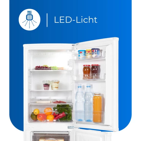 Die Kühl und Gefrierkombination ist die perfekte Lösung, wenn sie nur ein Gerät in ihrer Küche aufstellen aber trotzdem nicht auf ein großzügiges Gefrierfach verzichten wollen. Insgesamt stehen Ihnen 142 l Nutzinhalt zur Verfügung. Das Gerät hat die Abmaße 144,0 x 48,0 x 50,0 cm (Höhe/Breite/Tiefe) und hat die Energieeffizienzklasse F (Skala Energieeffizienzklasse A bis G). Durch seine freistehende Bauart lässt es sich an jedem Ort aufstellen und in Betrieb genommen werden. Das Gerät bietet Ihnen über 87,0 l Nutzinhalt in seinem Kühlbereich, welcher mit Hilfe von teilweise verstellbaren Ablagen praktisch unterteilt ist. Das Gemüsefach hält dabei Obst und Gemüse allzeit knackig und frisch. Der 4*-Gefrierbereich verfügt über eine Kapazität von 55,0 l und bietet den idealen Ort für Eis, Tiefkühlpizza und alles andere. Damit Sie auch bei schlechten Lichtverhältnissen zielsicher an Ihre Lebensmittel gelangen, bietet Ihnen das Gerät eine Beleuchtung.