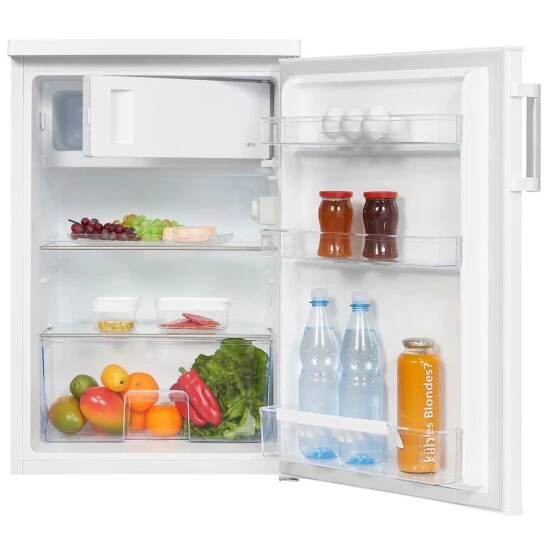 Der Kühlschrank sorgt für das komfortable und sichere Lagern Ihrer Lebensmittel und Getränke. Insgesamt stehen Ihnen 120 l Nutzinhalt zur Verfügung. Das Gerät hat die Abmaße 85,0 x 56,0 x 57,5 cm (Höhe/Breite/Tiefe) und hat die Energieeffizienzklasse D (Skala Energieeffizienzklasse A bis G). Durch seine freistehende Bauart lässt es sich an jedem Ort aufstellen und in Betrieb genommen werden. Das Gerät bietet Ihnen über 107,0 l Nutzinhalt in seinem Kühlbereich, welcher mit Hilfe von teilweise verstellbaren Ablagen praktisch unterteilt ist. Das Gemüsefach hält dabei Obst und Gemüse allzeit knackig und frisch. Der 4*-Gefrierbereich verfügt über eine Kapazität von 13,0 l und bietet den idealen Ort für Eis, Tiefkühlpizza und alles andere. Mit der digitalen Temperaturanzeige haben sie jederzeit die gewählten Einstellungen im Blick. Über ein gut lesbares Display haben Sie die gewünschte Temperatur jederzeit im Blick und können bequem einzelne Funktionen des Gerätes steuern. Damit Sie auch bei schlechten Lichtverhältnissen zielsicher an Ihre Lebensmittel gelangen, bietet Ihnen das Gerät eine Beleuchtung.
