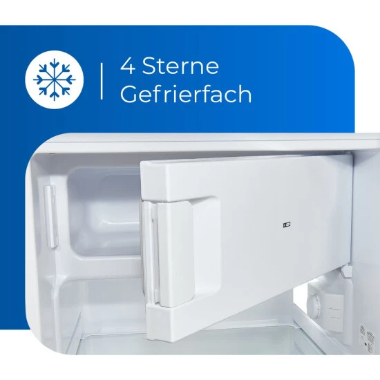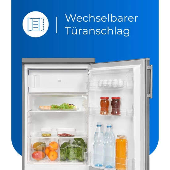 Der Kühlschrank sorgt für das komfortable und sichere Lagern Ihrer Lebensmittel und Getränke. Insgesamt stehen Ihnen 109 l Nutzinhalt zur Verfügung. Das Gerät in der Farbe Edelstahloptik hat die Abmaße 85,5 x 55,0 x 57,0 cm (Höhe/Breite/Tiefe) und hat die Energieeffizienzklasse E (Skala Energieeffizienzklasse A bis G). Durch seine freistehende Bauart lässt es sich an jedem Ort aufstellen und in Betrieb genommen werden. Der wechselbare Türanschlag sorgt hierbei für noch mehr Flexibilität beim Aufstellen. Das Gerät bietet Ihnen über 95,0 l Nutzinhalt in seinem Kühlbereich, welcher mit Hilfe von teilweise verstellbaren Ablagen praktisch unterteilt ist. Flaschen- und Butterfach schaffen Ordnung in Ihrem Kühlgerät. Der 4*-Gefrierbereich verfügt über eine Kapazität von 14,0 l und bietet den idealen Ort für Eis, Tiefkühlpizza und alles andere. Damit Sie auch bei schlechten Lichtverhältnissen zielsicher an Ihre Lebensmittel gelangen, bietet Ihnen das Gerät eine Beleuchtung.