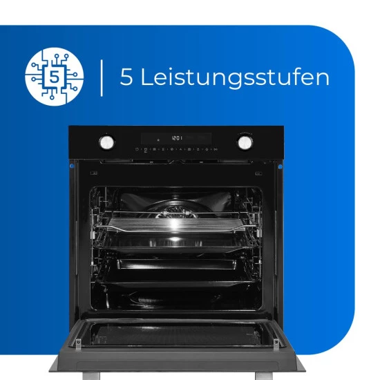 Die EBEM 797-H-030 schwarz mit der Gehäusefarbe Schwarz ist eine Einbau-Mikrowelle aus dem Hause Exquisit und begeistert mit einer Vielzahl von Funktionen. Sie hat einen Garraum von 72 Liter. Als Einbau-Mikrowelle fügt sie sich optimal in ihre vorhandene Küchenfront ein und vervollständigt Ihre bisherige Küchenausstattung. Die Abmessungen des Gerätes betragen 59,1 x 59,5 x 56,6 cm (Höhe/Breite/Tiefe). Die Mikrowelle besitzt eine Gesamtleistung von 1600 W, die Sie in 5 Stufen steuern können. So sind Sie für jede Gegebenheit bestens gewappnet. Die Heißluft-Funktion mit maximal 1800 W ergänzt Ihre Möglichkeiten und macht die EBEM 797-H-030 schwarz zu einem wahren Alleskönner. Darüber hinaus verfügt die Mikrowelle über eine Grill-Funktion, mit deren Hilfe Sie Ihre Speisen einfach unter dem eingebauten Grill zubereiten können. Dank des integriertem Timers (digital) behalten Sie die Restlaufzeit Ihrer Programme immer im Blick. Durch die komfortable Innenbeleuchtung behalten sie Ihre Speisen ständig im Blick.