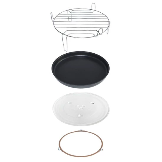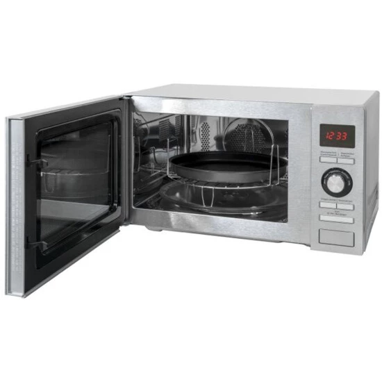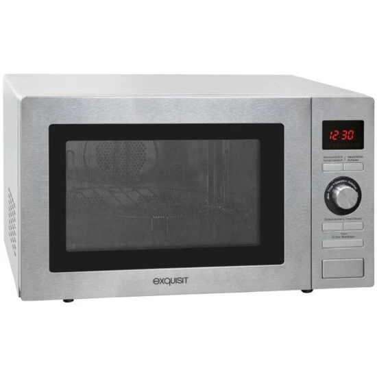 Die MW 9025 H-3 mit der Gehäusefarbe Silber ist eine Mikrowelle aus dem Hause Exquisit und begeistert mit vielfältigen Funktionen. Sie besitzt eine Front in der Farbe Silber/Glas und hat einen Garraum von 25 Liter. Durch Ihre freistehende Bauform kann die Mikrowelle überall problemlos aufgestellt werden. Sie braucht nur einen Stromanschluss. Die Abmessungen des Gerätes betragen 28,0 x 51,0 x 46,0 cm (Höhe/Breite/Tiefe). Die Gesamtleistung von 900 W unterteilt in 5 Stufen bietet Ihnen maximale Flexibilität in der Zubereitung und Aufwärmen Ihrer Mahlzeiten. Die Heißluft-Funktion mit maximal 2500 W ergänzt Ihre Möglichkeiten und macht die MW 9025 H-3 zu einem wahren Alleskönner. Darüber hinaus verfügt die Mikrowelle über eine Grill-Funktion, mit deren Hilfe Sie Ihre Speisen einfach unter dem eingebauten Grill zubereiten können. Dank der Leistung von maximal 1100 W werden Ihre Speisen im Handumdrehen knusprig und kross. Die Mikrowelle besitzt wie erwartet einen Timer (digital). Mit diesem haben Sie die Restlaufzeit Ihres Programmes immer im Blick.Durch die komfortable Innenbeleuchtung behalten sie Ihre Speisen durchgehend im Blick. Damit Ihre Speisen optimal zubereitet werden, sorgt der integrierte Drehteller mit einem Durchmesser von 31,5 cm. So werden Ihre Speisen gleichmäßig erwärmt.