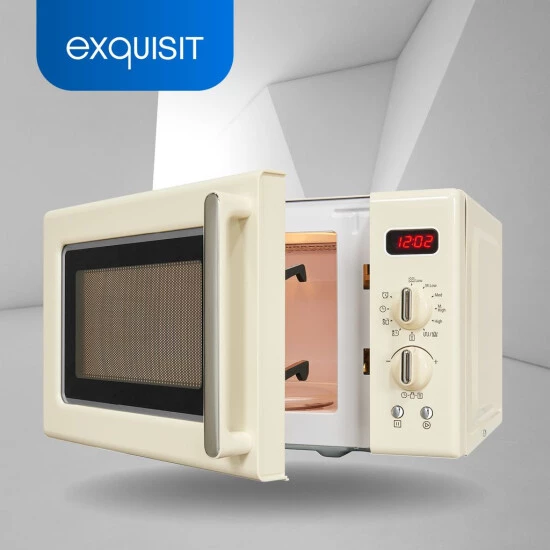 Die RMW720-3GDIG ist eine Mikrowelle aus dem Hause exquisit und begeistert mit zahlreichen Funktionen. Sie bietet einen Garraum von 20 Liter. Durch Ihre freistehende Bauart kann die Mikrowelle überall einfach positioniert werden. Sie braucht nur einen Stromanschluss. Das Gerät für sich hat folgende Ausmaße: 25,9 x 44 x 36 cm (Höhe/Breite/Tiefe). Die Mikrowelle liefert eine Gesamtleistung von 700 W, die Sie in 5 Stufen regulieren können. So sind Sie für jede Gegebenheit bestens vorbereitet. Dank des integriertem Timers (manuell) behalten Sie die Restlaufzeit Ihrer Programme jederzeit im Blick. Selbst bei schlechten Lichtverhältnissen behalten Sie Dank der hellen Innenbeleuchtung der Mikrowelle den Überblick. Für eine gleich mäßige Erwärmung Ihrer Speisen sorgt der integrierte Drehteller mit einem Durchmesser von 25,5 cm.