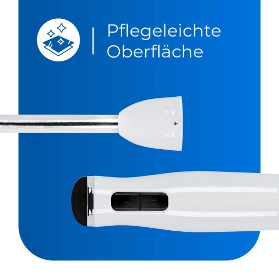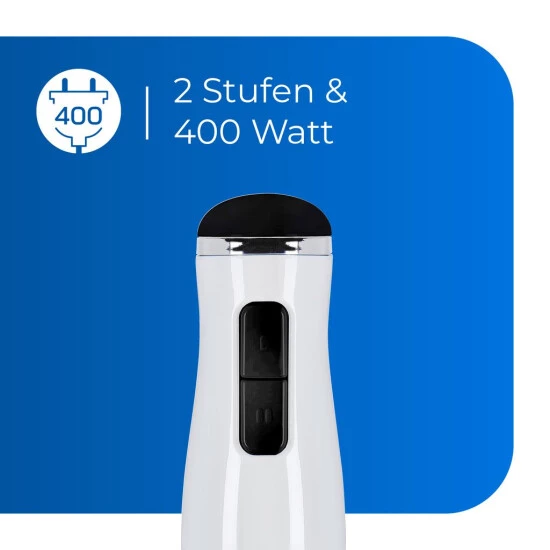 Stabmixer mit max. 400 Watt, robuste und anhaltend scharfe Klingen zur Zerkleinerung auch harter Lebensmittel, 2 Leistungsstufen, leichte Reinigung durch abnehmbaren Metallfuß und eine optimale ergonomische Handhabung.
