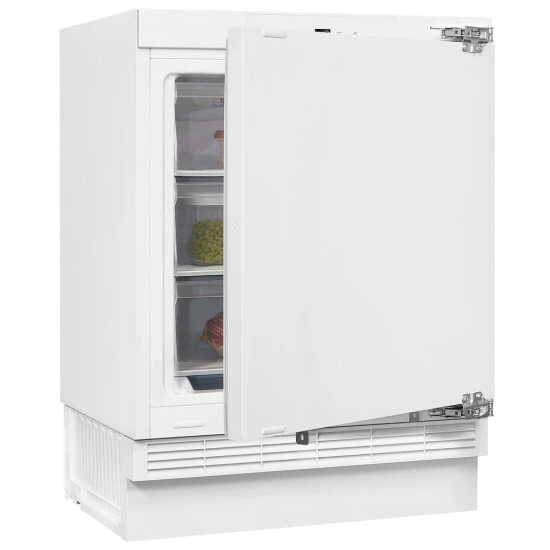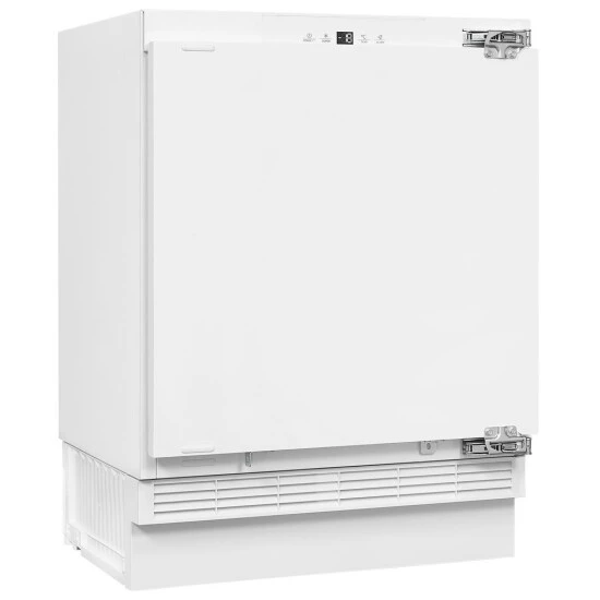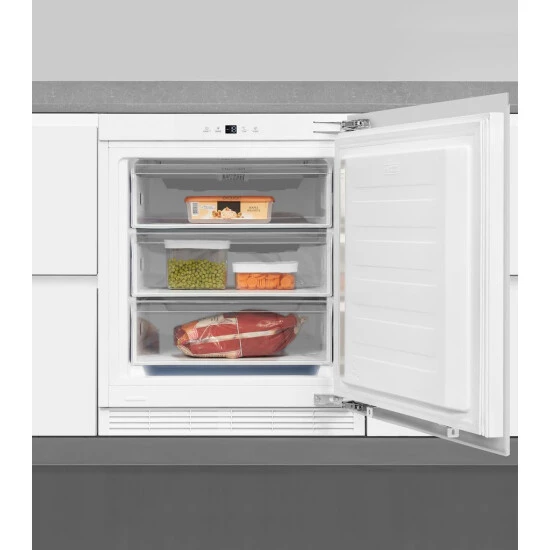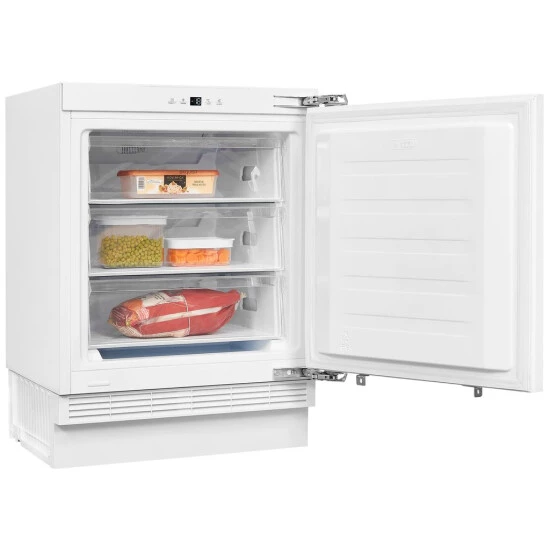 Der Gefrierschrank bietet reichlich Platz für sorgenfreies Lagern über einen längeren Zeitraum. Insgesamt stehen Ihnen 97 l Nutzinhalt zur Verfügung. Das Gerät in der Farbe Weiß hat die Abmaße 82,3 x 59,5 x 54,5 cm (Höhe/Breite/Tiefe) und hat die Energieeffizienzklasse F (Skala Energieeffizienzklasse A bis G). Als Einbaugerät fügt es sich stilsicher in beinahe jede Küche nahtlos ein. Der wechselbare Türanschlag sorgt hierbei für noch mehr Flexibilität beim Aufstellen. Der 4*-Gefrierbereich verfügt über eine Kapazität von 97,0 l und bietet den idealen Ort für Eis, Tiefkühlpizza und alles andere. Eine spezielle Schnell-Gefrierfunktion sorgt dafür, dass Ihre Lebensmittel in kürzester Zeit eingefroren werden. Über ein gut lesbares Display haben Sie die gewünschte Temperatur jederzeit im Blick und können bequem einzelne Funktionen des Gerätes steuern.