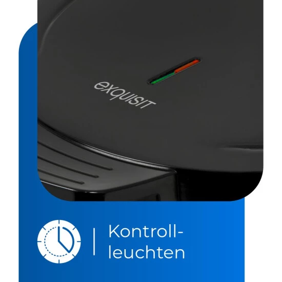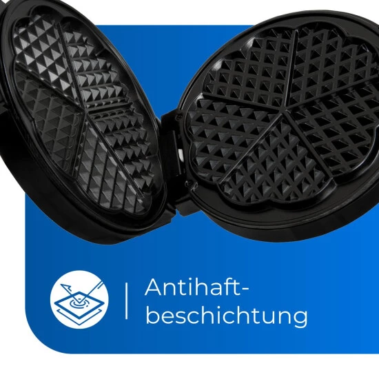 Im Handumdrehen 5 perfekt gelungene Herzwaffeln zaubert das schwarze Waffeleisen von Exquisit. Fettarme Zubereitung, einfaches Herausnehmen der Waffeln und müheloses Reinigen dank der hochwertigen antihaftbeschichteten Backfläche. Dank der stufenlos einstellbaren Temperatur und der Kontrolllampen werden die Waffeln auf den Punkt perfekt gebacken. Durch die rutschfesten Standfüße hat der Waffelautomat einen sicheren Stand, durch die auf dem Griff stehende Aufbewahrung und die integrierte Kabelaufwicklung kann er schnell und platzsparend verstaut werden.